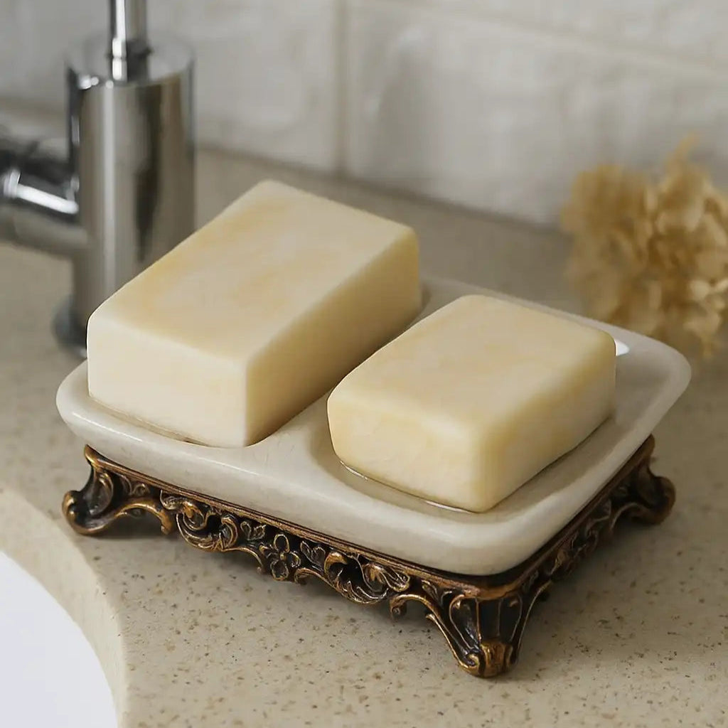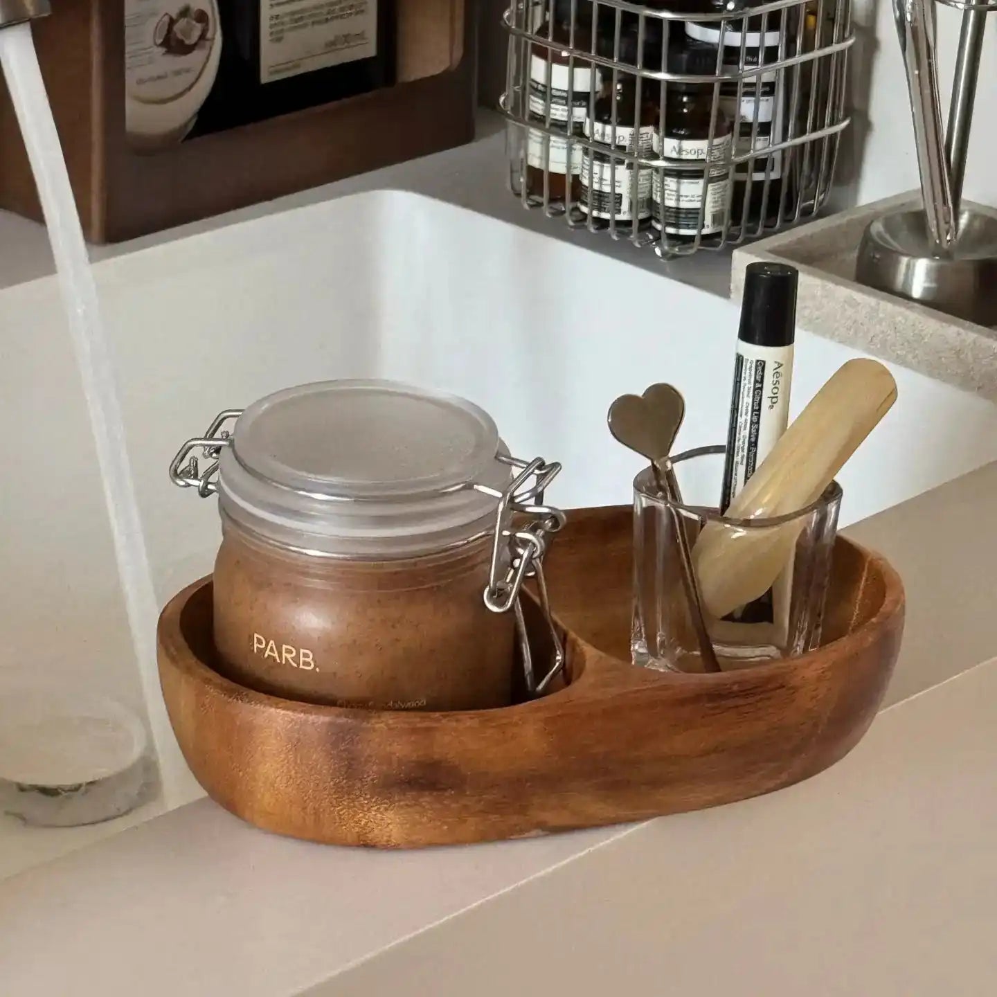 - Natural spa style: Brown natural loofah, wooden soap tray, and linen towels for a calming vibe