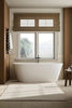 A freestanding soaking tub, positioned near expansive windows, invites natural light to flow freely, creating a serene and airy atmosphere. The frameless glass shower enclosure showcases large neutral-toned tiles, paired with matte black fixtures, delivering a modern yet inviting aesthetic.